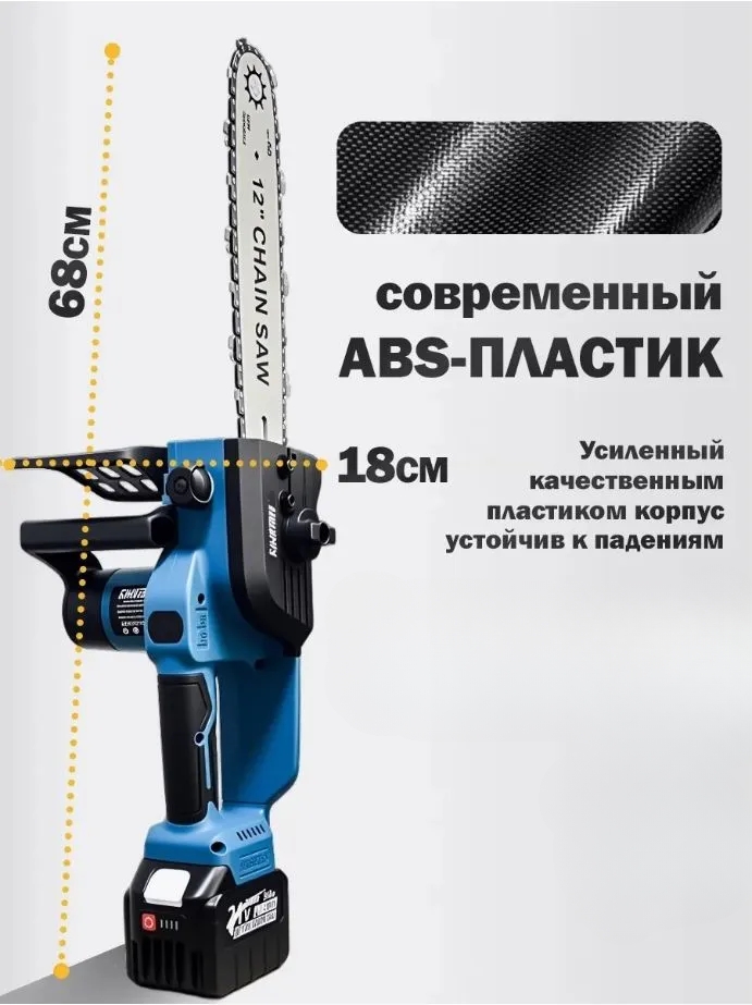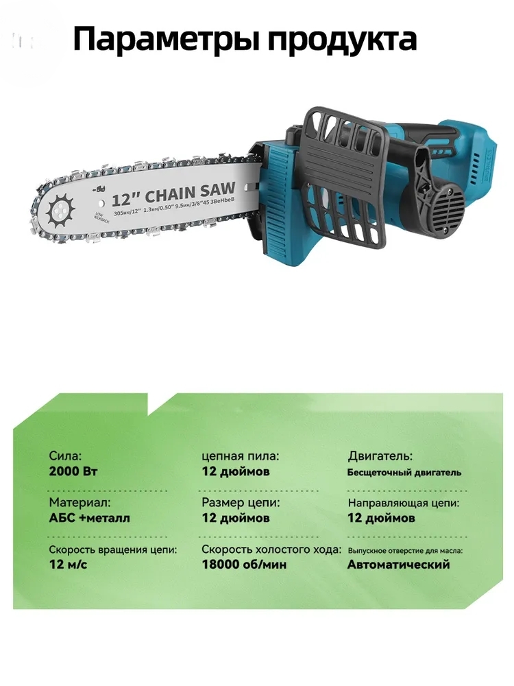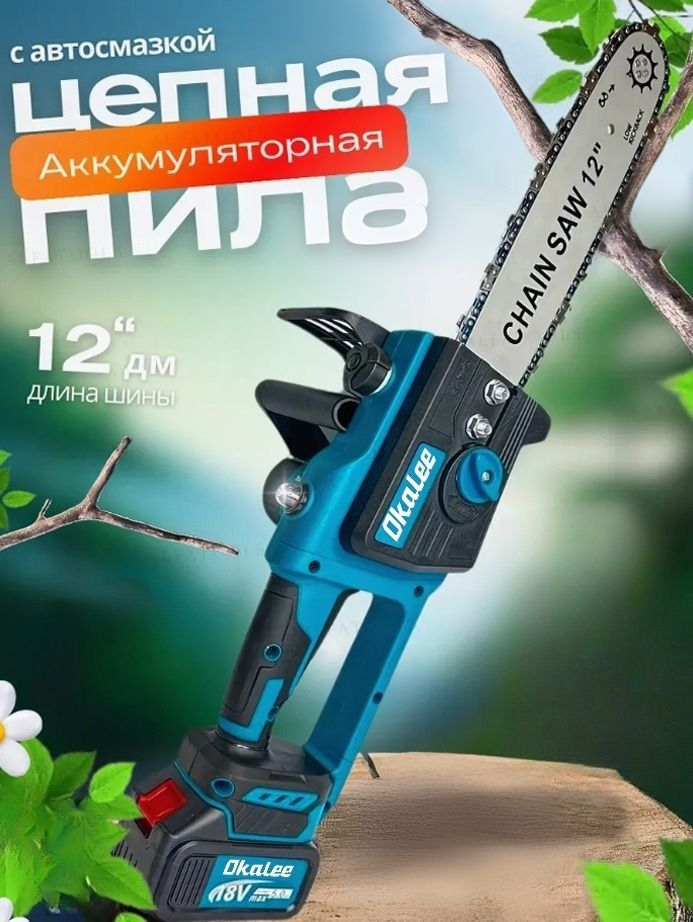 • Комплектация - Пила цепная; шина 12 дюймов; цепь 45 звеньев; 1 АКБ 21В 4Ач; зарядная станция; инструкция; кейс